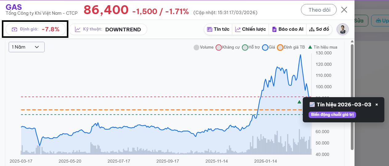 Dưới đây là một ví dụ về cổ phiếu GAS. Khi giá dầu và giá khí bật tăng do xung đột tại Iran, chiến lược Biến động chuỗi giá trị bắt đầu phát tín hiệu trong phiên 03/03. Tại thời điểm đó, cổ phiếu đang giao dịch quanh mức 115.000đ, trong khi định giá trung bình của các công ty chứng khoán chỉ khoảng 80.000đ — tương đương thị giá cao hơn khoảng 43% so với định giá hợp lý. Xét theo các chỉ số như P/E và P/B, mức định giá tại thời điểm này cũng đã vượt xa trung bình 3 năm.