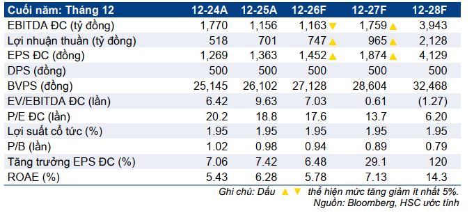- Giao dịch với P/E forward ~16.7x, thấp hơn đáng kể so với mức ~26.6x trong quá khứ (HSC)