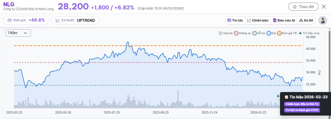 Với NLG, tín hiệu từ chiến lược đầu tư giá trị xuất hiện vào phiên 23/2 tại vùng giá 28,750đ. Tuy nhiên một cổ phiếu có thể rẻ trong một thời gian dài nếu thị trường chưa thay đổi hành vi. Vì vậy, việc mua ngay không phải lúc nào cũng tối ưu.